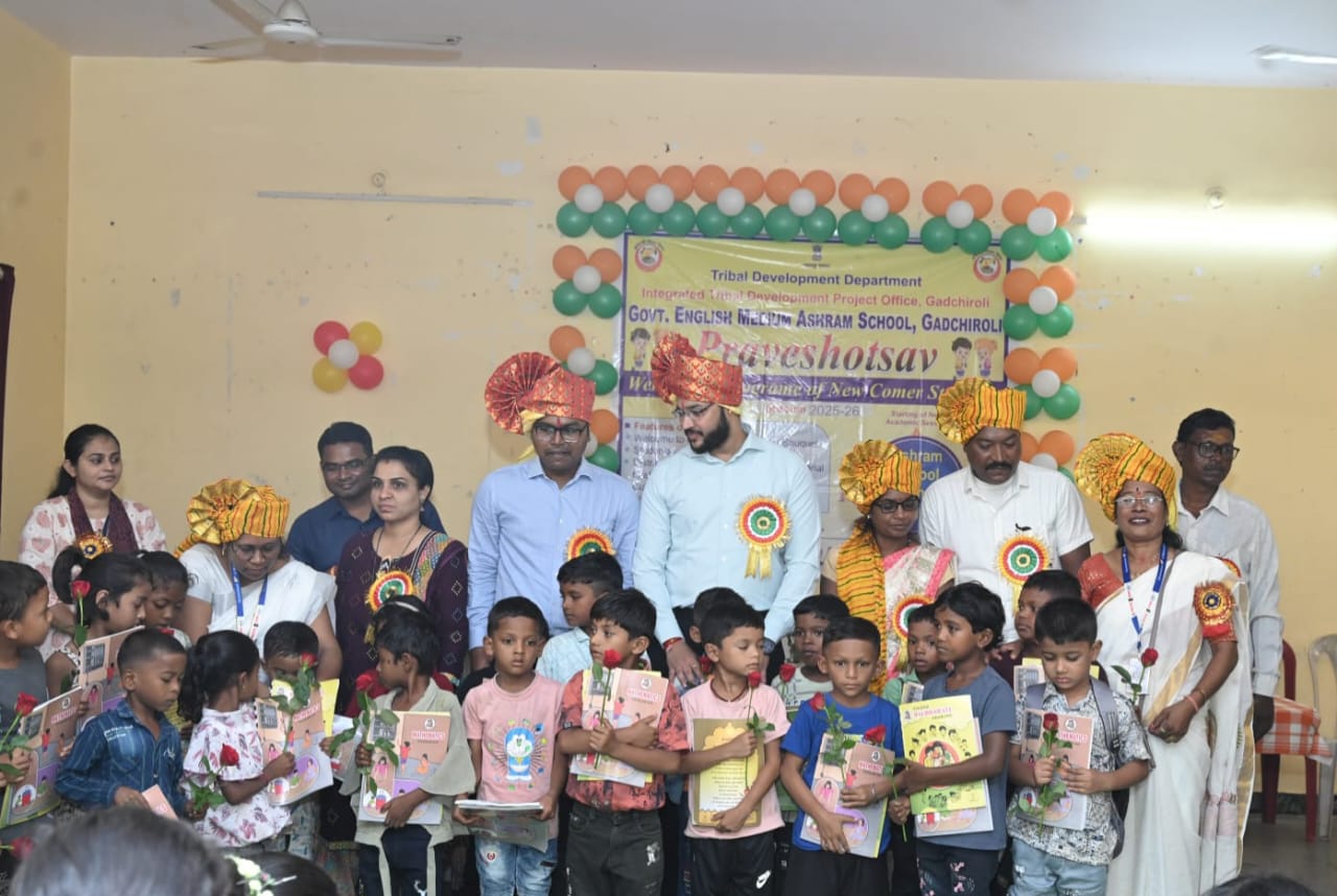 गडचिरोली : एकात्मिक आदिवासी विकास प्रकल्प गडचिरोली अंतर्गत स्थानिक शासकीय इंग्रजी माध्यम आश्रम शाळेत शुक्रवार, २७ जून रोजी प्रवेशोत्सव कार्यक्रम मोठ्या उत्साहात पार पडला. शाळेच्या पहिल्या दिवशी मान्यवरांनी वृक्षारोपण केले. यामध्ये विद्यार्थ्यांनी सहभाग घेतला. घोड्यावर बसवून विद्यार्थ्यांचे स्वागत करण्यात आले. नवागत विद्यार्थ्यांना पाठ्यपुस्तके व गणवेशाचे वितरण करण्यात आले.सांस्कृतिक कार्यक्रमाचे आयोजन करण्यात आले. उपस्थित सर्व विद्यार्थ्यांची आरोग्य तपासणी करण्यात आली.