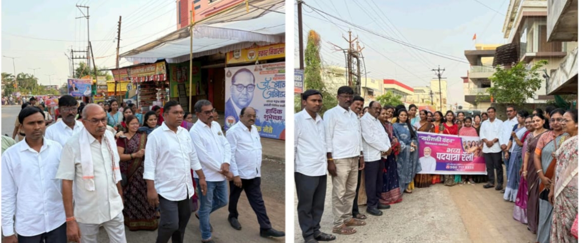 गडचिरोली : गडचिरोली शहरात ‘नारी शक्ती वंदन विधेयकाच्या’ समर्थनार्थ आयोजित करण्यात आलेल्या भव्य पदयात्रा रॅलीमध्ये उपस्थित राहून महिला शक्तीचा उत्साह अनुभवला. मा. पंतप्रधान नरेंद्र मोदी यांनी महिलांना ३३% आरक्षण देऊन दिलेला सन्मान हा खऱ्याअर्थाने नव्या भारताच्या निर्मितीचा पाया आहे.