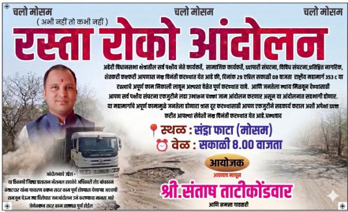 गडचिरोली : मागील सहा वर्षांपासून प्रलंबित असलेल्या NH 353 C या राष्ट्रीय महामार्गाच्या अर्धवट कामामुळे नागरिक आणि वाहनधारकांना जगणे कठीण झाले आहे. मात्र प्रशासन उदासीन असल्याचे दिसून येत आहे. त्यामुळे नागरिकांमध्ये तीव्र नाराजी व्यक्त केली जात आहे. वारंवार निवेदने देऊनही कंत्राटदार आणि राष्ट्रीय महामार्ग विभाग ठोस कारवाई करीत असल्याने आज २९ एप्रिल २०२६ रोजी मौजा मोसम येथील संड्रा फाटा येथे तीव्र रस्ता रोको’ आंदोलन करण्यात येत असल्याची माहिती भ्रष्टाचार निवारण समितीचे गडचिरोली जिल्हाध्यक्ष संतोष रामचंद्र ताटीकोंडावार यांनी दिली आहे.